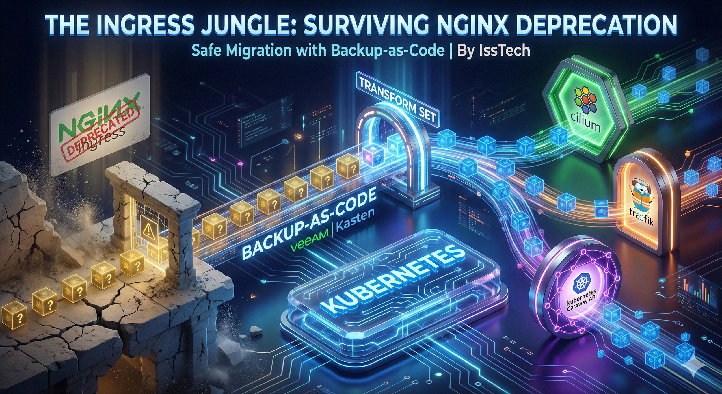 IssTech proposes a "Backup-as-Code" strategy using Veeam Kasten to solve this. By backing up your live NGINX application and restoring it to a test cluster, you can validate new controllers safely using real data.