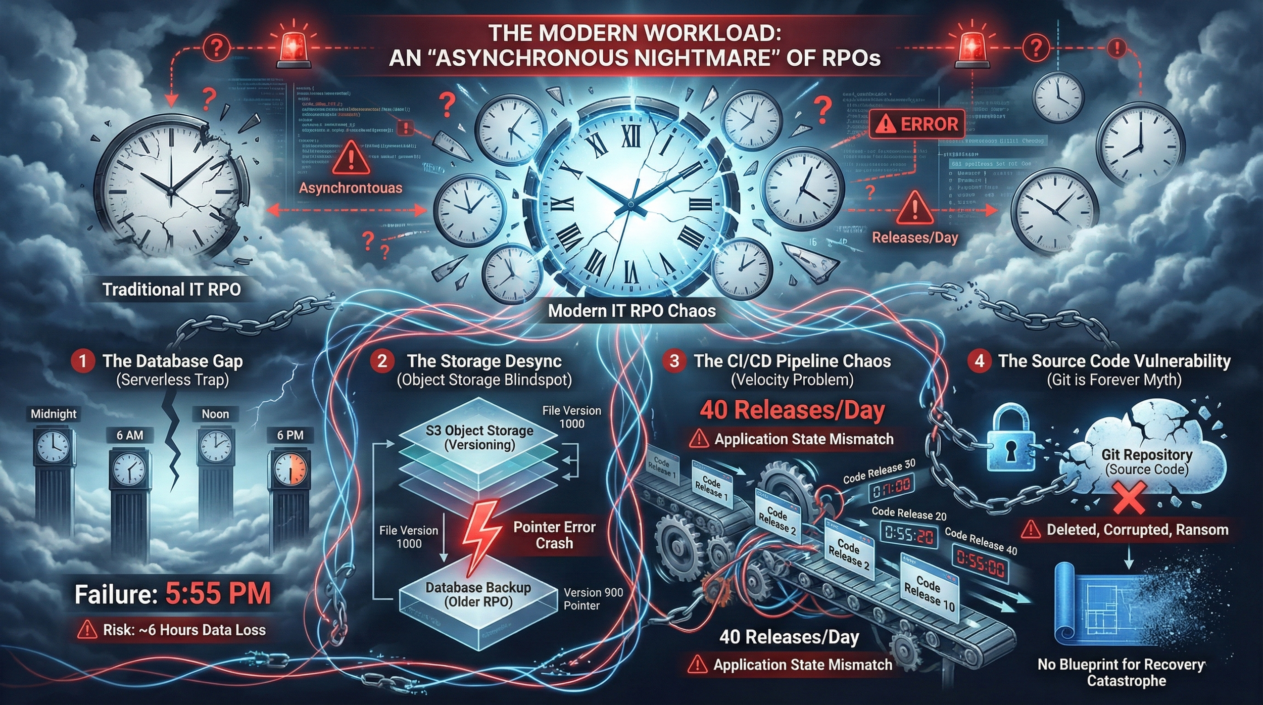 Modern IT has lagged behind, suffering from an "Asynchronous Nightmare" where code, data, and databases operate on conflicting backup schedules.