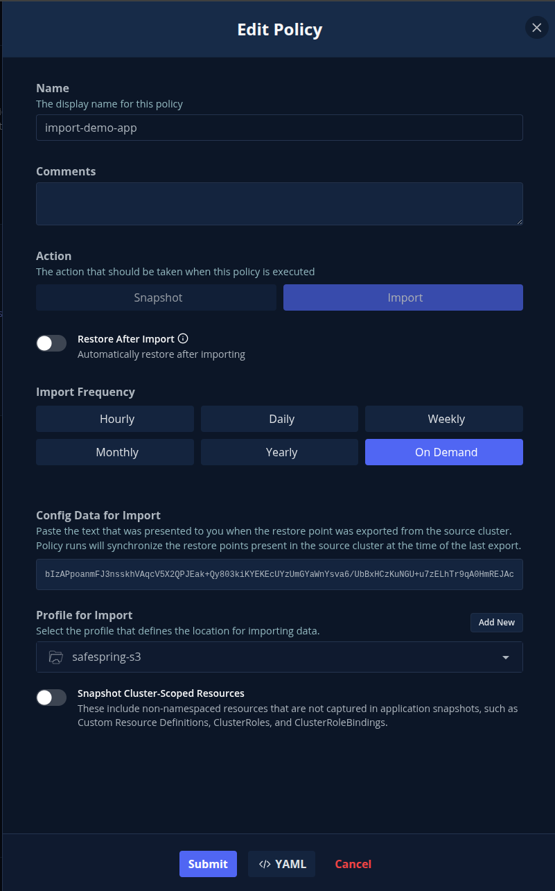 2. Import to the Test Cluster Open Veeam Kasten in your test environment. Go to Policies -> Create New Policy -> Action: Import. Paste the token from your production cluster and select the profile that points to your S3 bucket.