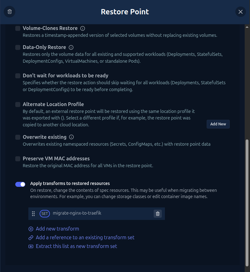 3. Execution When performing the restore in the wizard, simply select the migrate-nginx-to-traefik Transform Set.